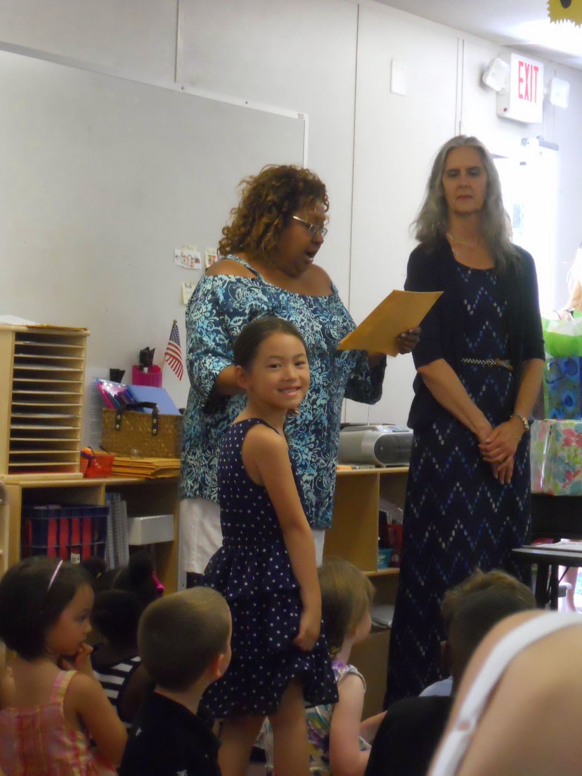 The class all sat down, and the teachers presented individual awards to each student. Little Miss received the "Daring Diver" award which meant she enthusiastically dove into new experiences and loved to try new things. She also received a perfect progress report. She had a few "P" (progressing) marks at the half-way point and received all "M" (mastered) marks at the end of the year.